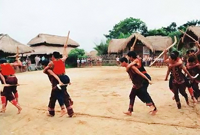 (附图:穿着节日服装在茅寨里为游客表演)