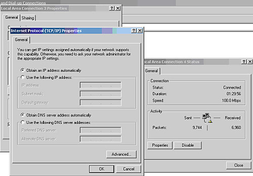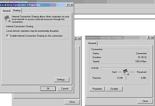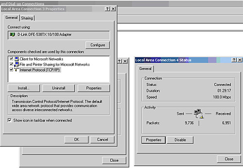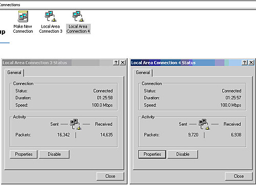 做服务器的电脑上两张网卡,第一张连接上网的MODEM,第二张连接HUB或SWITCH,连好线接,通电源以後,在弹出的窗口中会出现两个连接的图标: