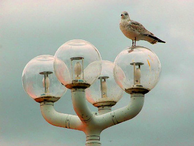 敢和凤凰比一遭 --------------- 这只不起眼的水鸥站在对过的路灯上遥看凤台上的凤凰。