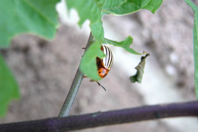吃饱了吃好了 --------------- 没有天敌的土豆甲虫很惬意,吃饱了长得圆滚滚的了,童年时期也就宣告结束。 很容易从枝叶上爬到地面上来。