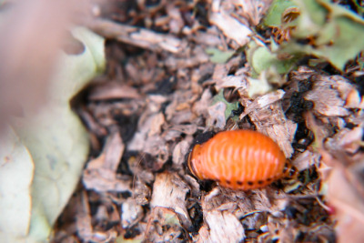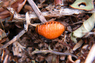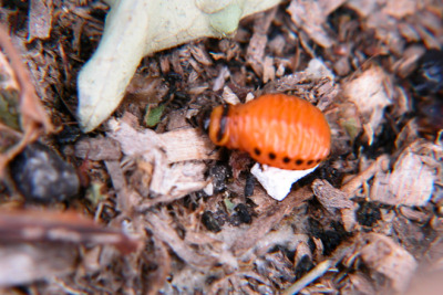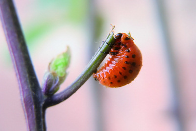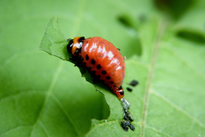 幼虫 --------------- 土豆甲虫的幼虫是暗红色的,从出生开始,就日夜不停地吃东西,除了拉屎,或者转移寻找新的叶片,基本上是不抬头连续地吃。