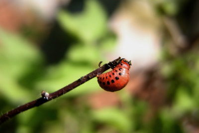 盛夏来了 --------------- 新一代的成虫长大了,大热天的,雄虫竟然还想交配,不想交配的雌虫不会反抗也不会拒绝,她不理睬 ,雄虫也就没有办法。 只管多吃一点,多存些脂肪以越过秋天,漫长的秋天和仍旧严寒的早春。有些不同种的土豆甲虫则是产卵越冬。