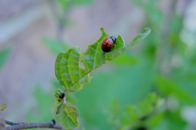 土豆的天敌 --------------- 土豆属茄科,大多数的茄科植物都怕土豆甲虫。土豆甲虫就喜欢吃茄科植物的叶子,因为这一类的小虫特别喜欢吃土豆叶子,所以被叫做土豆甲虫。 下图是土豆甲虫中的一种。这种土豆甲虫不好看,不上镜。咱挑另一种好看一点的拍。