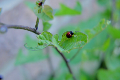 交配 --------------- 越过严寒冬天的甲虫在土坷缝中躲藏几个月以後,春天来了并不急于出来,一直等到茄科植物长得茂盛了,才爬出来大吃特吃。 待到雌虫吃得肥了,雄虫吃得壮了,就凑成对交配。雄虫总是显得猴急,雌虫却慢吞吞地继续吃,一边吃一边边拉屎,对急于求爱的雄虫不大理睬。