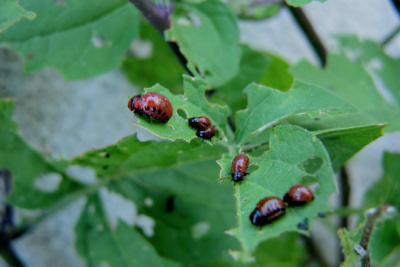 幼虫 --------------- 土豆甲虫的幼虫是暗红色的,从出生开始,就日夜不停地吃东西,除了拉屎,或者转移寻找新的叶片,基本上是不抬头连续地吃。 土豆的生长周期短,土豆甲虫的时间也抓得紧,根本就不睡觉。