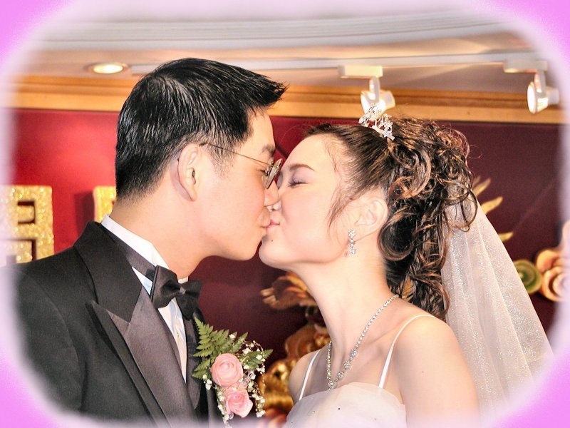 下面的照片,是木匠参加同事的婚礼时拍的。木匠的照相机当然已经全部设置好,方位,灯光的强弱,心中已经有谱。最重要的是,当新郎新娘扭扭捏捏不肯吻,公众在起哄的时候,你手里抓着相机,你可不要跟着起哄。你要有所预见,你要心里默想着做好准备。整个接吻的动作也就是两秒钟吧,新娘在开始的一秒,表情可能比较紧张,通常随後的一秒钟里,表现会自然一些。