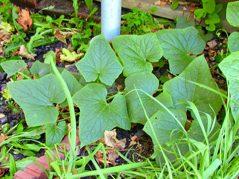 图一。用中档机--F4.0光圈--拍的照片。由于光线太暗,机上的闪光灯自动工作,韭菜的影子留在了黄瓜的叶子上。如果没有闪光灯,全部效果就会像那阴影的地方一样,灰暗,色彩死板;